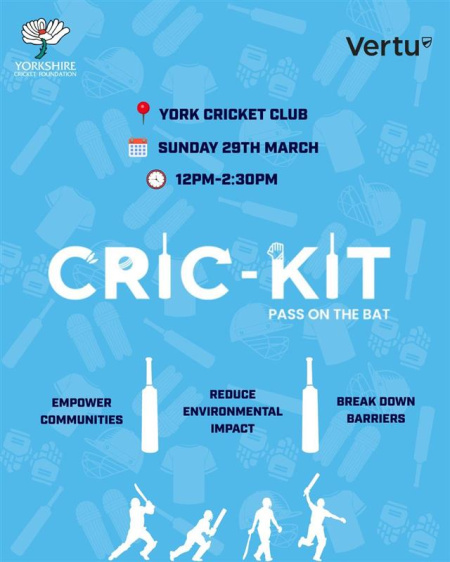 We will be bringing kit, from all 4 Cric-Kit Hubs to York Cricket Club on Sunday 29th March.